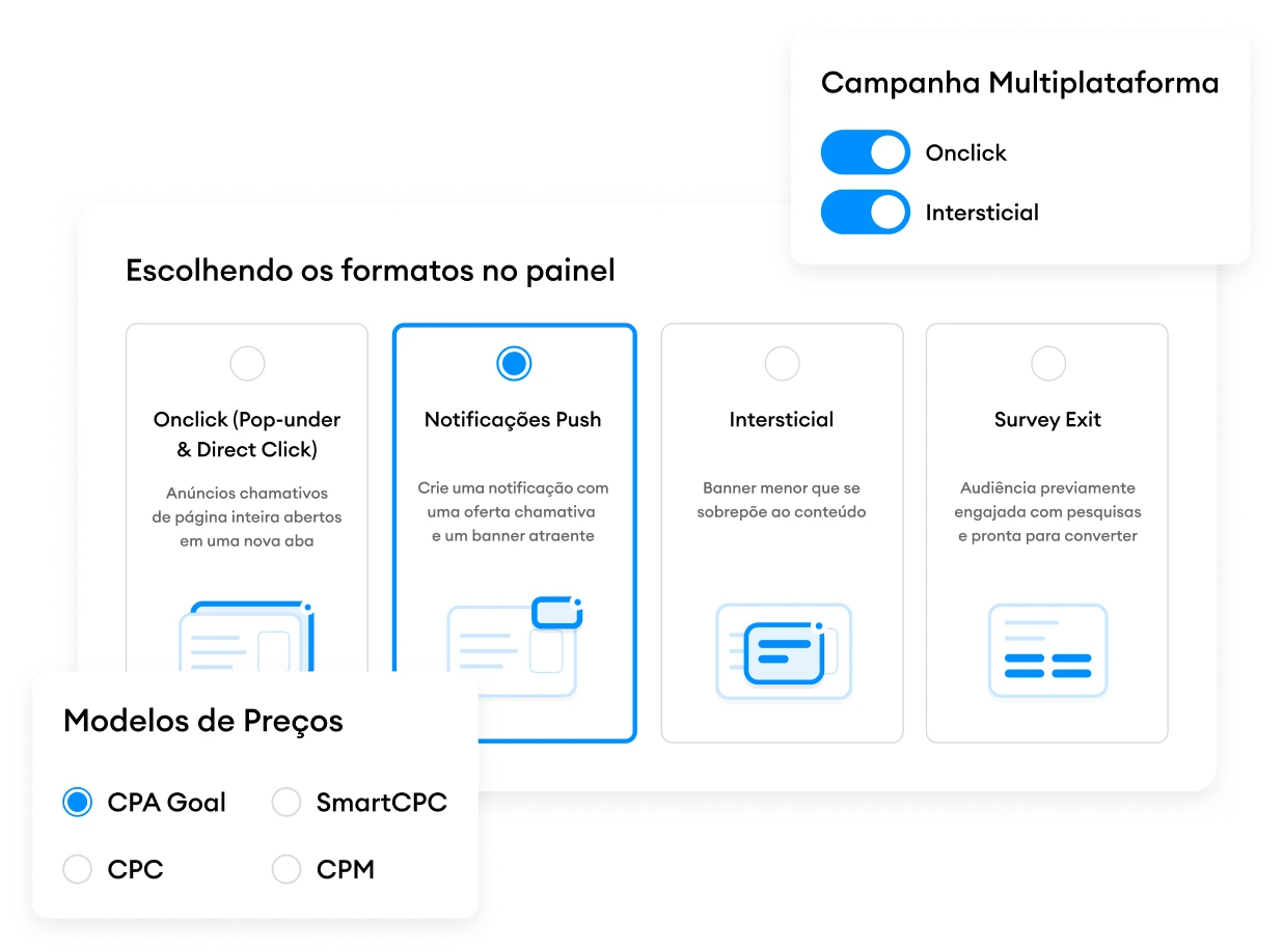 Escolha entre os formatos Pop-under, Clique Direto, Push, In-Page Push, Intersticial e Survey Exit